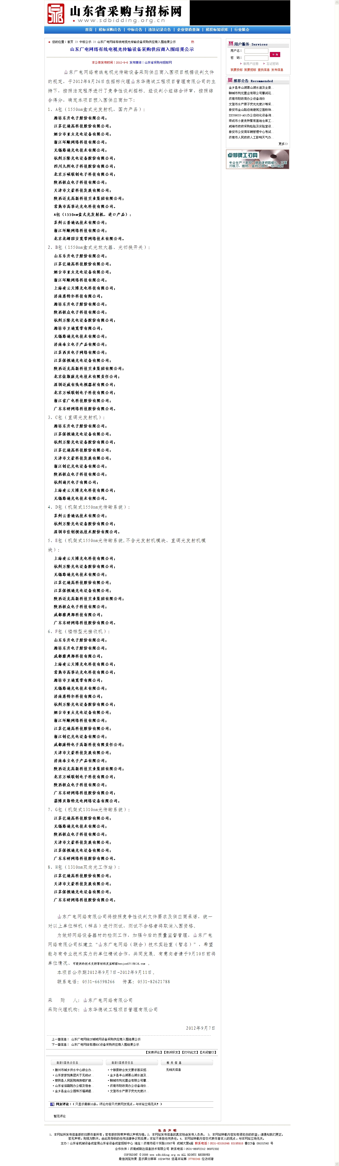 2012山东广电网络有线电视光传输设备采购供应商入围结果公示