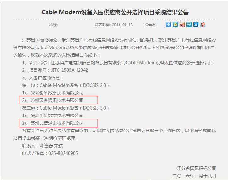 江苏省广电有线信息网络股份有限公司Cable Modem入围公告