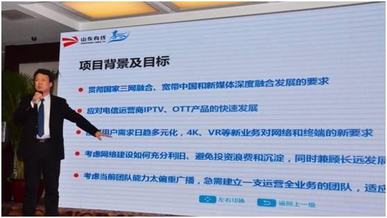山东广电网络集团总经理郝克远在致辞中表示,当下的山东广电也与全国广电一样,共同面临着互联网时代的巨大挑战,IPTV的竞争、OTT盒子蚕食部分市场,适应新形势、新变化,形成更加科学规范的管理体制和运行机制势在必行。通过在多地开展网络双向化和光纤到户的实践,我们发现,全业务IP化是广电网络的技术演进趋势。2015年滨州“享TV”业务应运而生,目前已发展了近5万用户,由此可见 “享TV”符合三网融合的要求,在全业务IP化的探索上具有开创性和引领性。